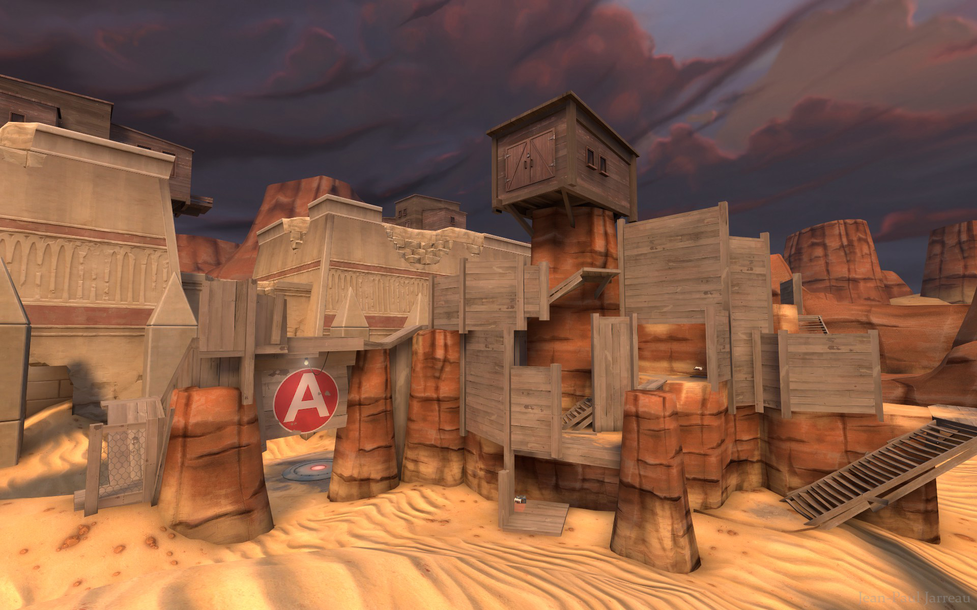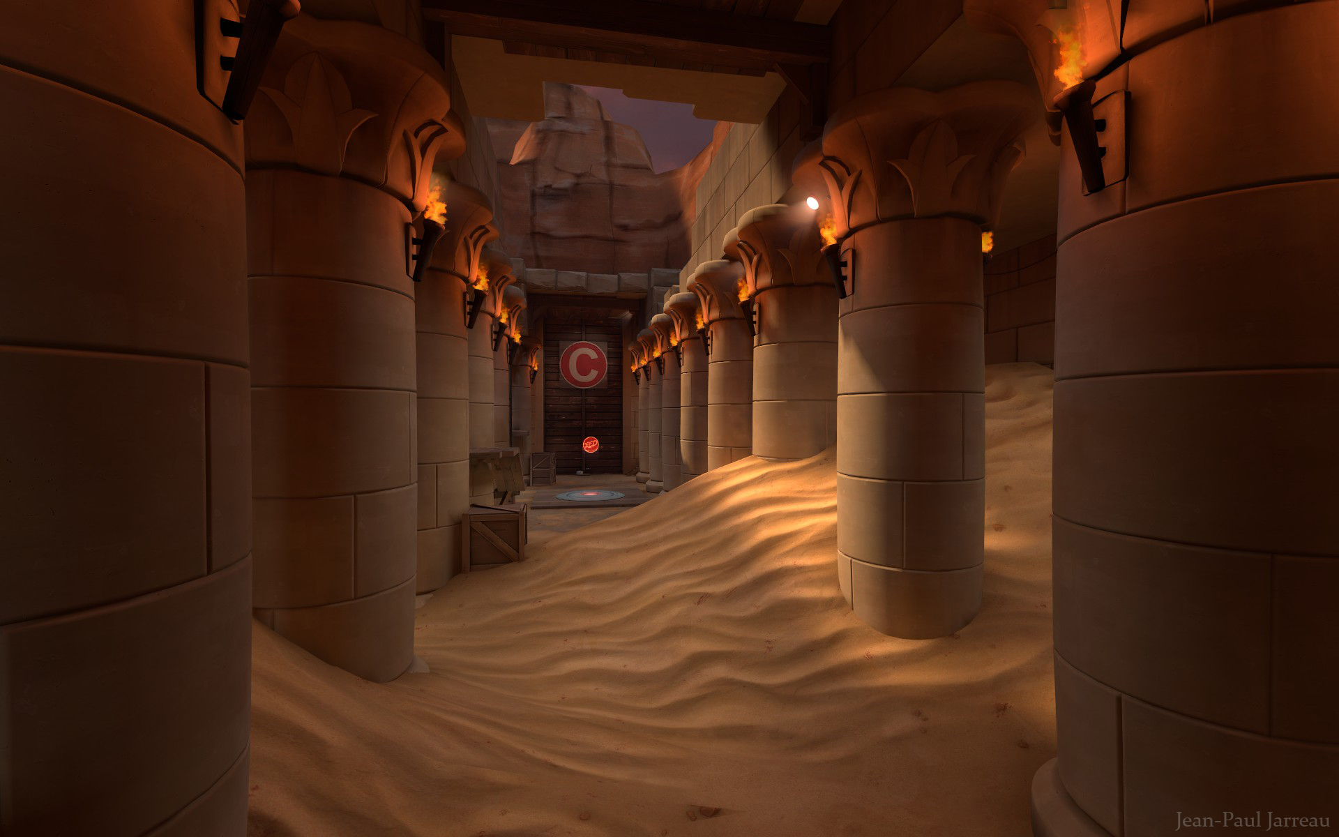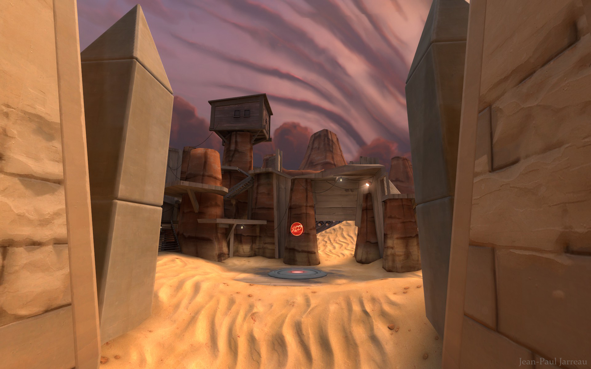 Osiris is an attack/defense multiplayer map for Valve's Team Fortress 2 set in an Egyptian temple. The goal of the design was to have battles spread over large sprawling sand dunes, tall shanty shacks, and tight corridors. Blue (attacking) team starts the map inside a giant drill machine and their objective is to capture each section of the map leading to the final area which is a mysterious source of energy for red (defending) team's massive laser.