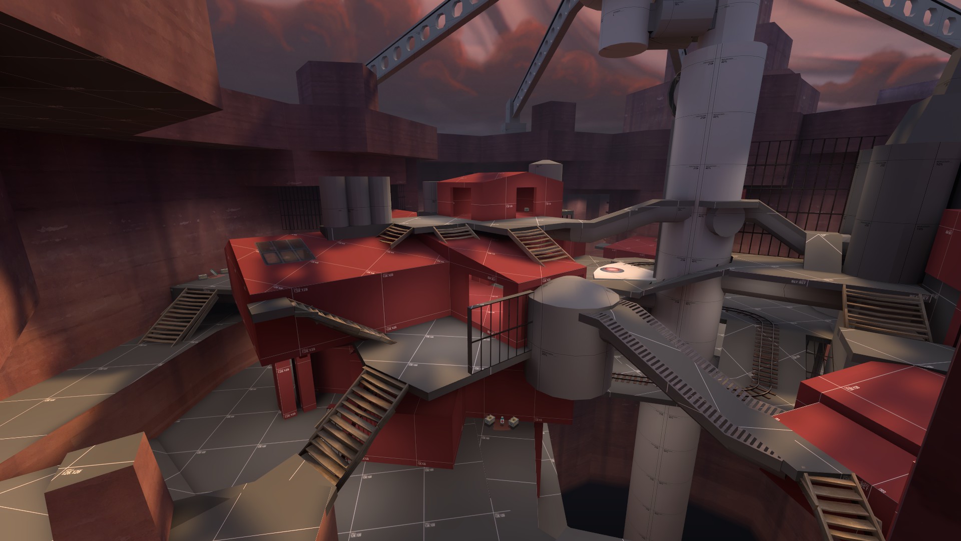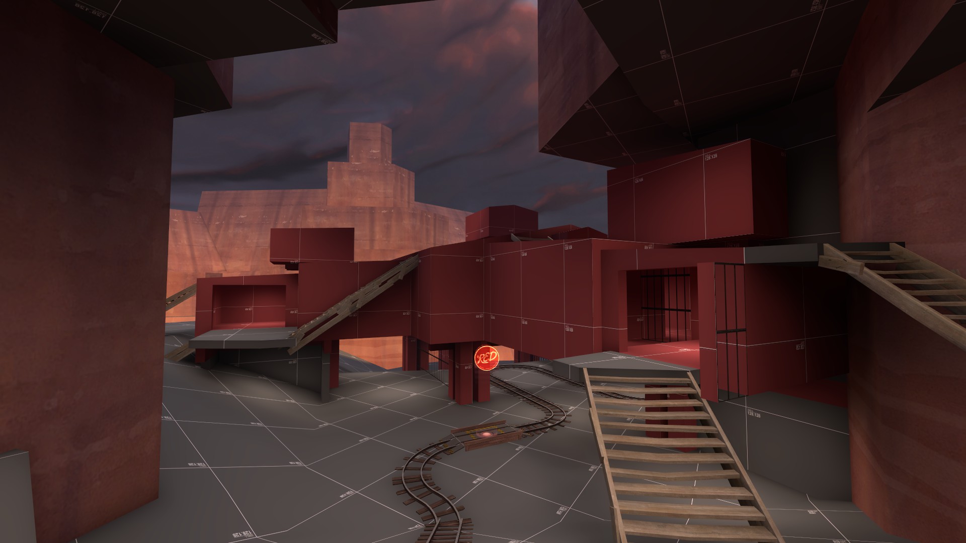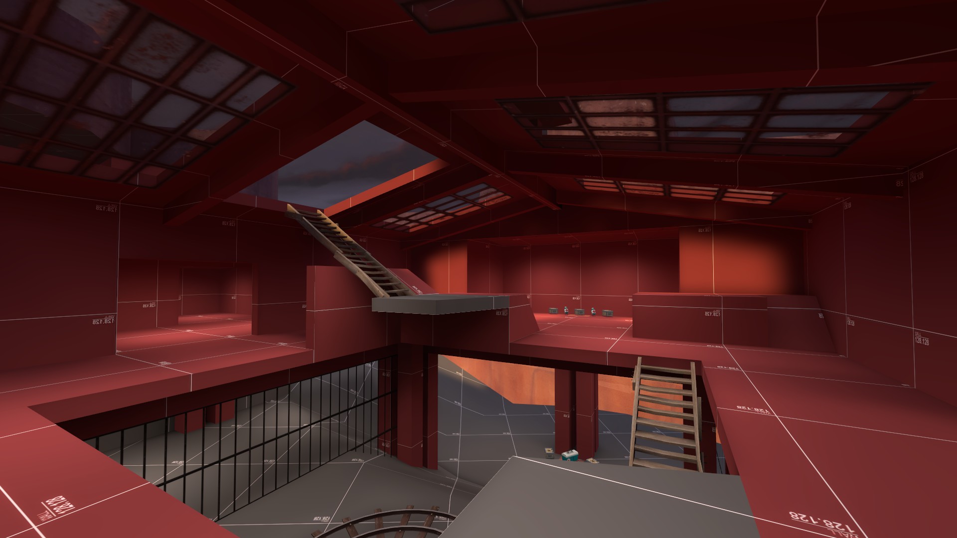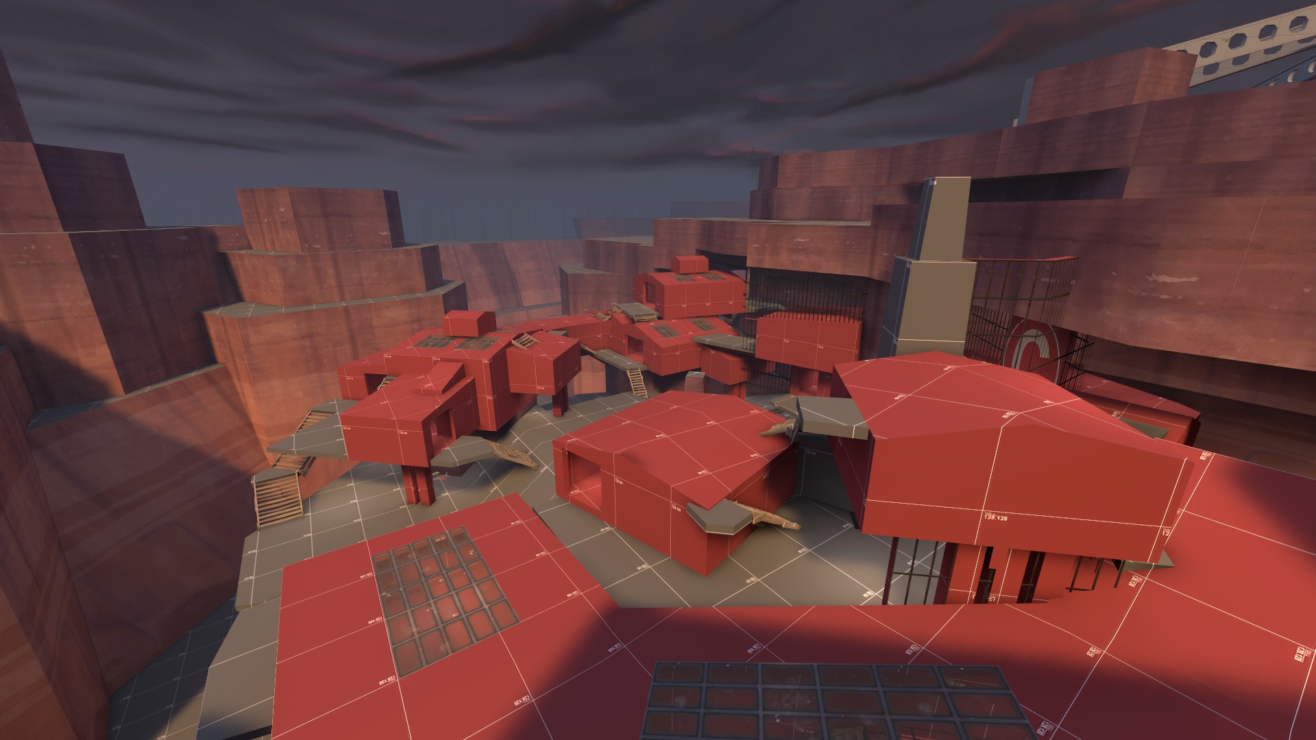 Red River is a payload map for Valve's Team Fortress 2 designed for 100 players and set in an janky abandoned mining facility surrounded by a snaking river death-pit. In July 2023 Valve released an update to TF2 which included a small patch note that increased the player limit from 32 to 100. Being a big fan of large player counts in multiplayer games I absolutely had to design a map to test the potential of the increase. Adding 68 players to the game is a huge shift to the overall gameplay dynamic. This shift, in addition to an increased difficulty in setting up a 100 player server and filling said server, meant I had to test the first few versions on the only popular 100 player community server in TF2. So, I rushed to make a layout in the early stages of the new player count.