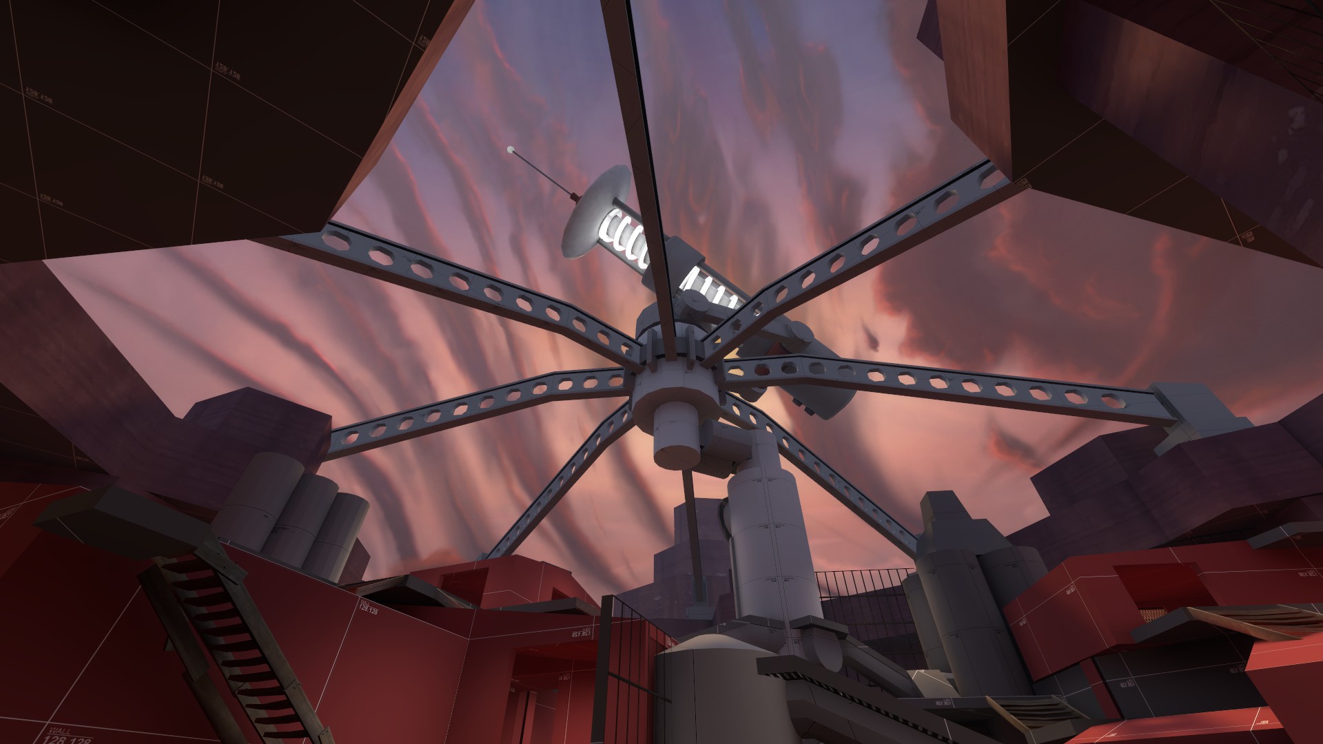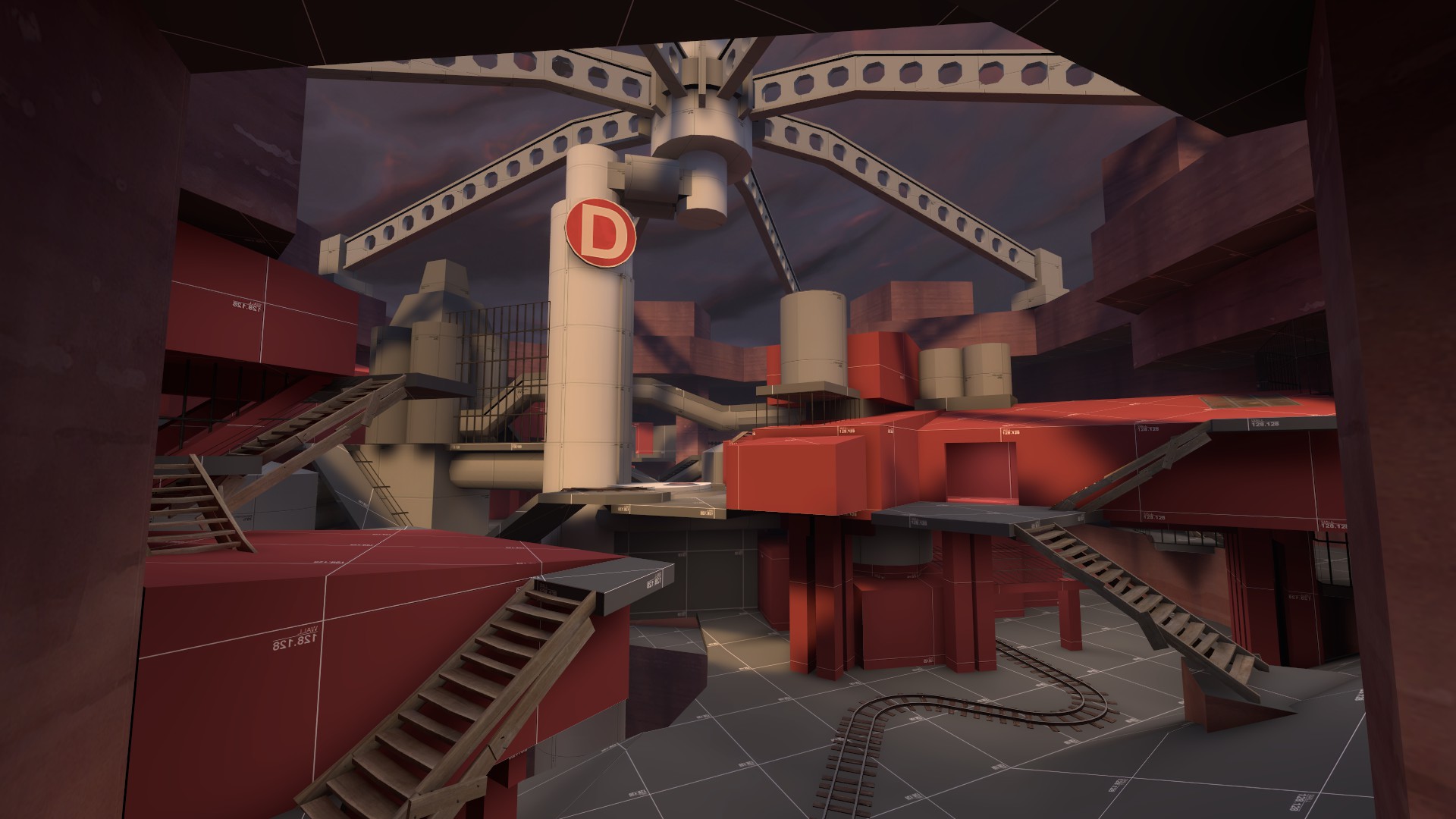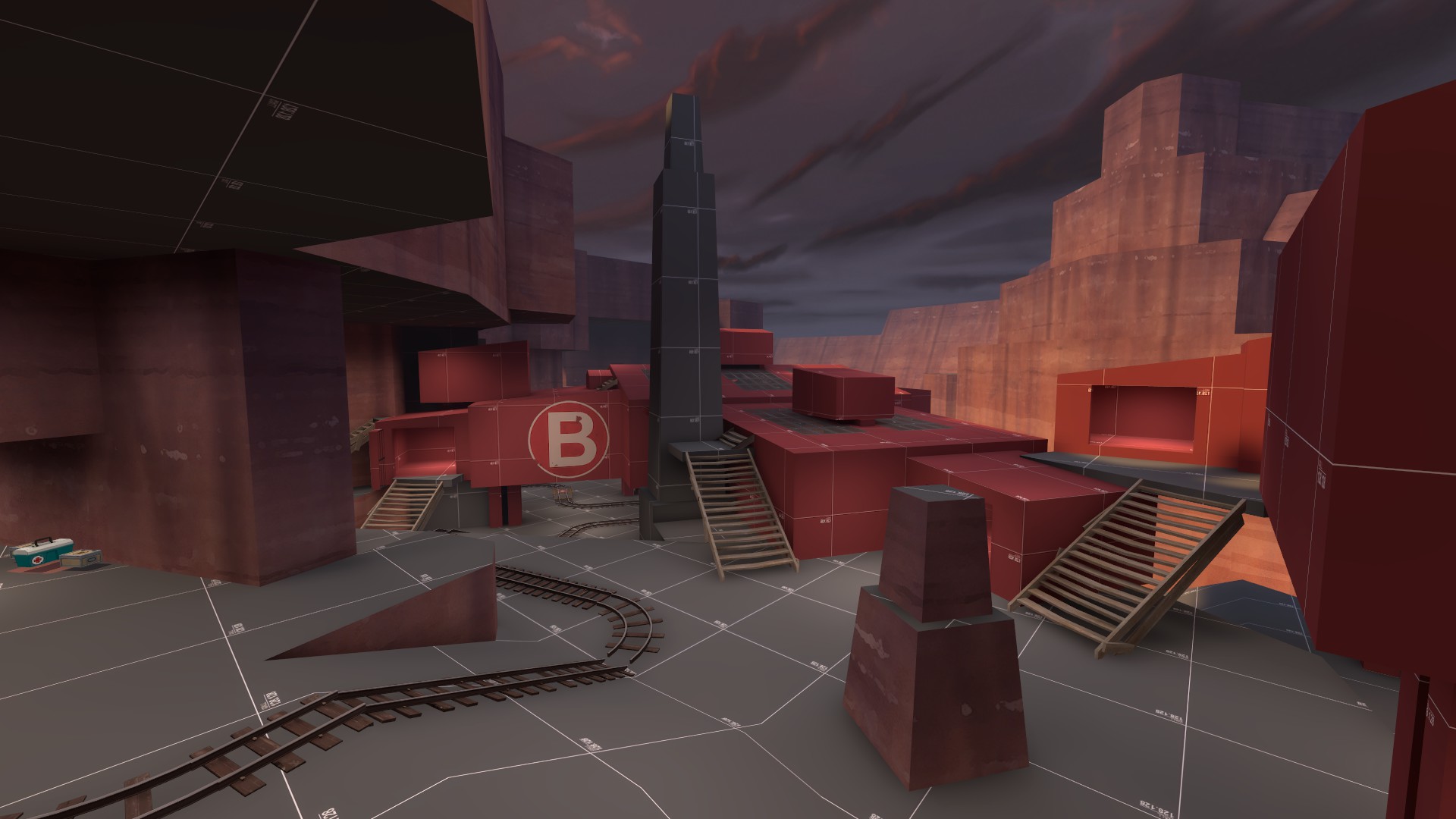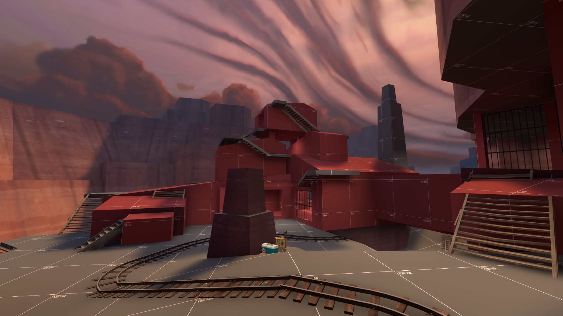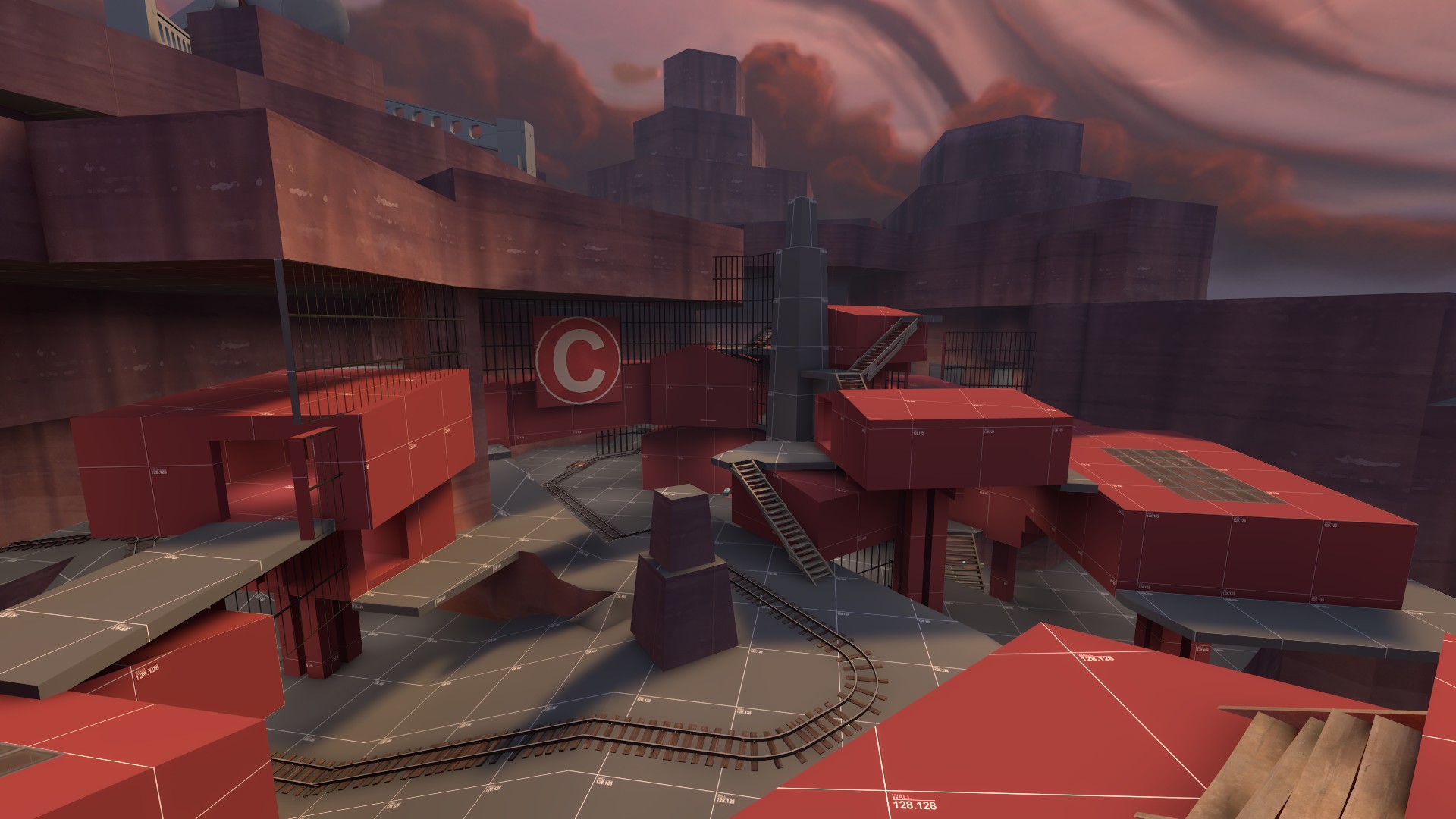 Red River is a payload map for Valve's Team Fortress 2 designed for 100 players and set in an janky abandoned mining facility surrounded by a snaking river death-pit. In July 2023 Valve released an update to TF2 which included a small patch note that increased the player limit from 32 to 100. Being a big fan of large player counts in multiplayer games I absolutely had to design a map to test the potential of the increase. Adding 68 players to the game is a huge shift to the overall gameplay dynamic. This shift, in addition to an increased difficulty in setting up a 100 player server and filling said server, meant I had to test the first few versions on the only popular 100 player community server in TF2. So, I rushed to make a layout in the early stages of the new player count.